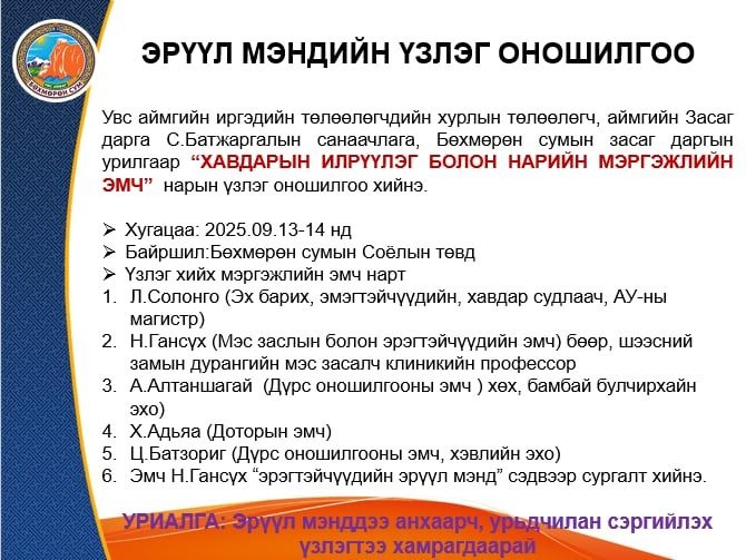Увс аймгийн ИТХ-ын төлөөлөгч, Аймгийн Засаг дарга С.Батжаргалын санаачлагаар "Хавдрын илрүүлэг болон нарийн мэргэжлийн эмч " нарын үзлэг оношлогоо 2025 оны 09 дүгээр сарын 13, 14-ний өдрүүдэд Бөхмөрөн суманд зохион байгуулагдана. Мөн эдгээр өдрүүдэд багийн Иргэдийн Нийтийн хурал болох тул малчид, иргэд хөдөлмөрчид та бүхэн багийн ИНХ-аа идэвхтэй оролцож, үзлэг оношлогоондоо идэвхтэй хамрагдахыг хүсье.