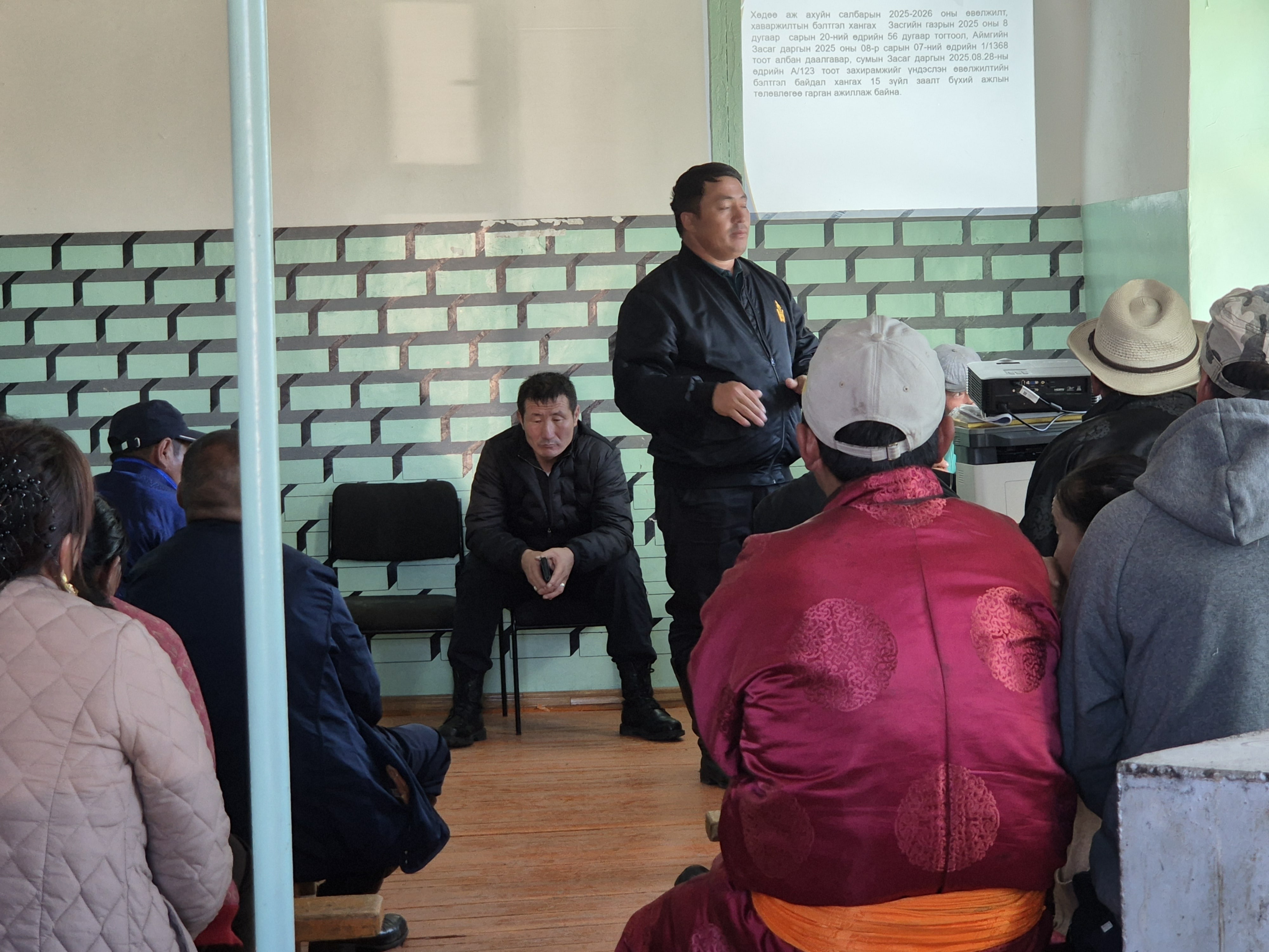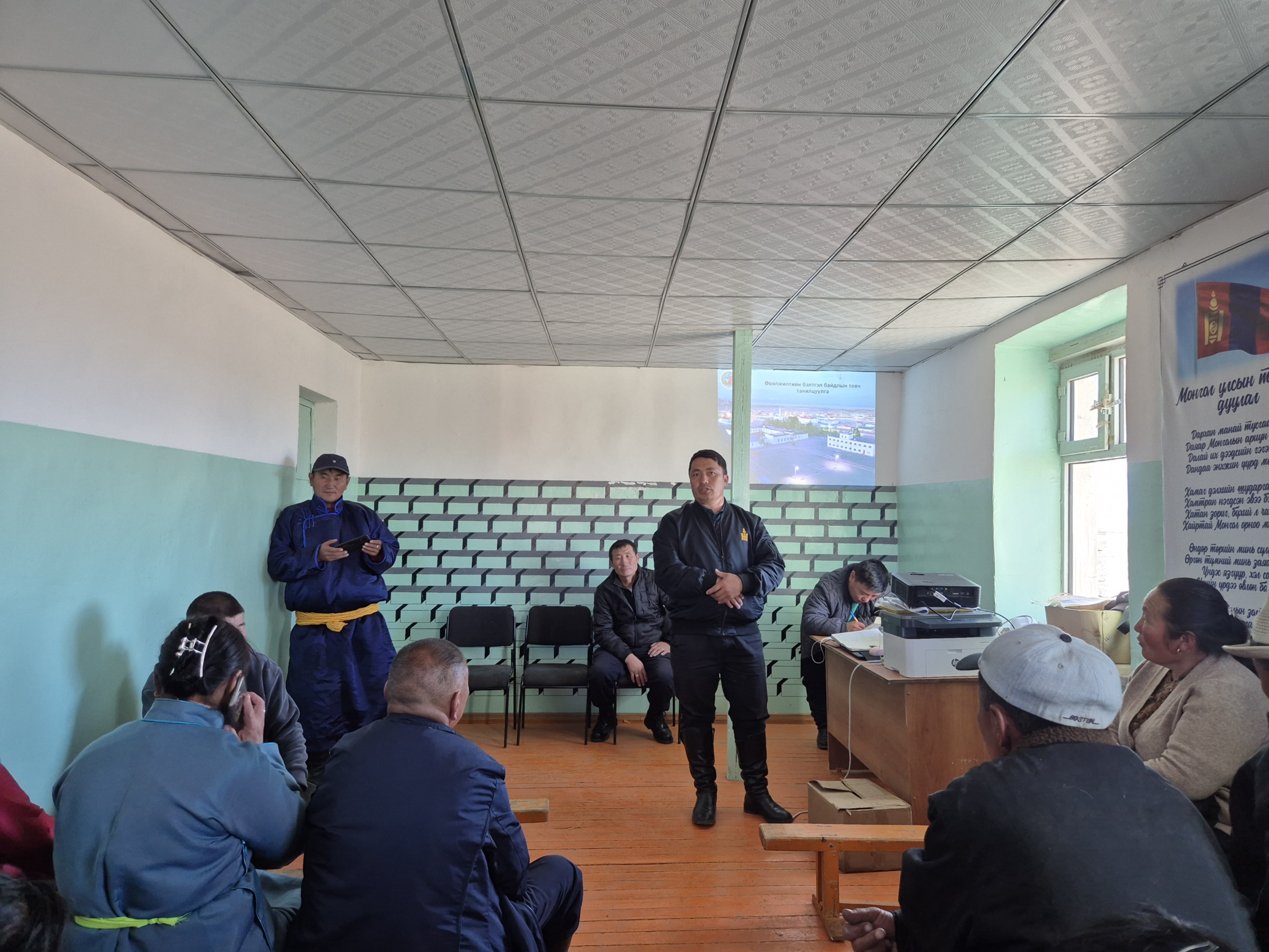 Багийн иргэдийн Нийтийн Хурлыгн хуралдаан болж, малчдад өвөлжилтийн бэлтгэл хангах талаар мэдээлэл өгч, өвөлжилт хүндрэх эрсдэлтэй үед авч хэрэгжүүлэх зарим арга хэмжээний талаар дэлгэрэнгүй мэдээлэл хүргэж, иргэдийн санал хүсэлтийг сонслоо.