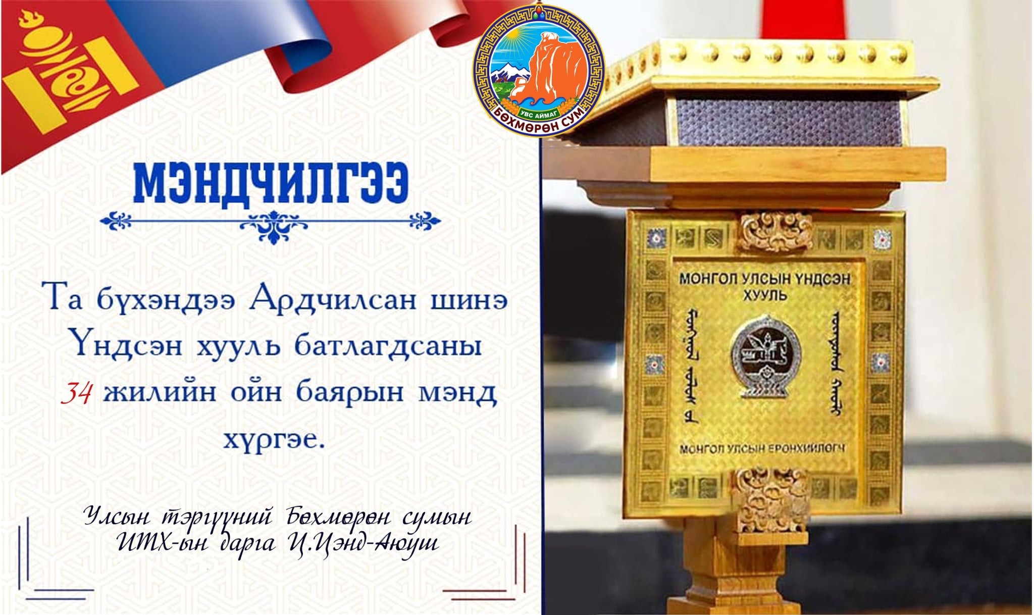 1992 оны 01 дүгээр сарын 13-ны энэ өдөр Монгол Улс ардчилсан шинэ Үндсэн хуулиа 6 бүлэг 70 зүйлтэйгээр Ардын Их Хурлаар хэлэлцэн батлахад Монгол Улсын хэмжээнд Ардын Их Хурлын 430 депутат, үүнээс Увс аймгийг төлөөлөн 19 депутат, Бөхмөрөн сумын 3 депутат Үндсэн хуулийг батлалцаж байсан түүхтэй. Монгол Улс ардчилсан шинэ Үндсэн хуулиа баталж, эх орон, тусгаар тогтнол, бүрэн эрхт байдлаа бататган бэхжүүлж, хүний эрх, эрх чөлөөг дээдэлсэн иргэн төвтэй төр улсыг тунхагласан түүхэн алхмыг хийсэн билээ. Энэхүү түүхт өдрийг тохиолдуулан Эх орныхоо тусгаар тогтнол, бүрэн эрхт байдлын баталгаа болсон Үндсэн хуулиа дээдлэн сахиж, иргэн бүр эрхээ эдэлж, үүргээ ухамсарлаж, тэгш эрх, эв нэгдэл, шударга ёс тогтсон нийгмийг хамтдаа цогцлоохыг хүсэн ерөөе.